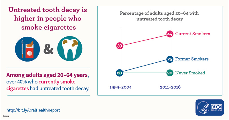 • Among adults aged 20–64 years, over 40% who currently smoke cigarettes had untreated tooth decay.
