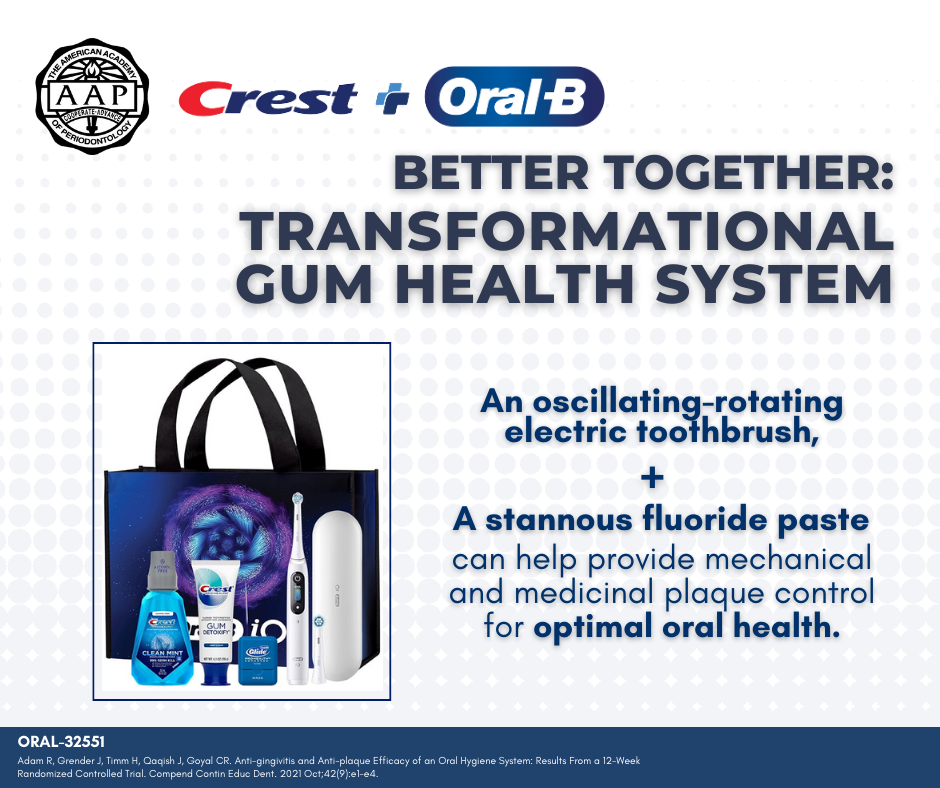 Crest + Oral-B’s Transformational Gum Health Electric Rechargeable System can transform patient gum health starting day 1. In a clinical study, 100% of patients moved to a state of healthy gums after just 12 weeks of use.